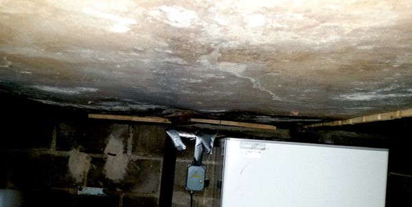 Det rekomenderas att avlägsna eventuellt svartmögel från trossbotten i krypgrunden. Bilden ovan ser man både svart- och vitmögel vilket är vanligt efter en längre tids fuktexponering.