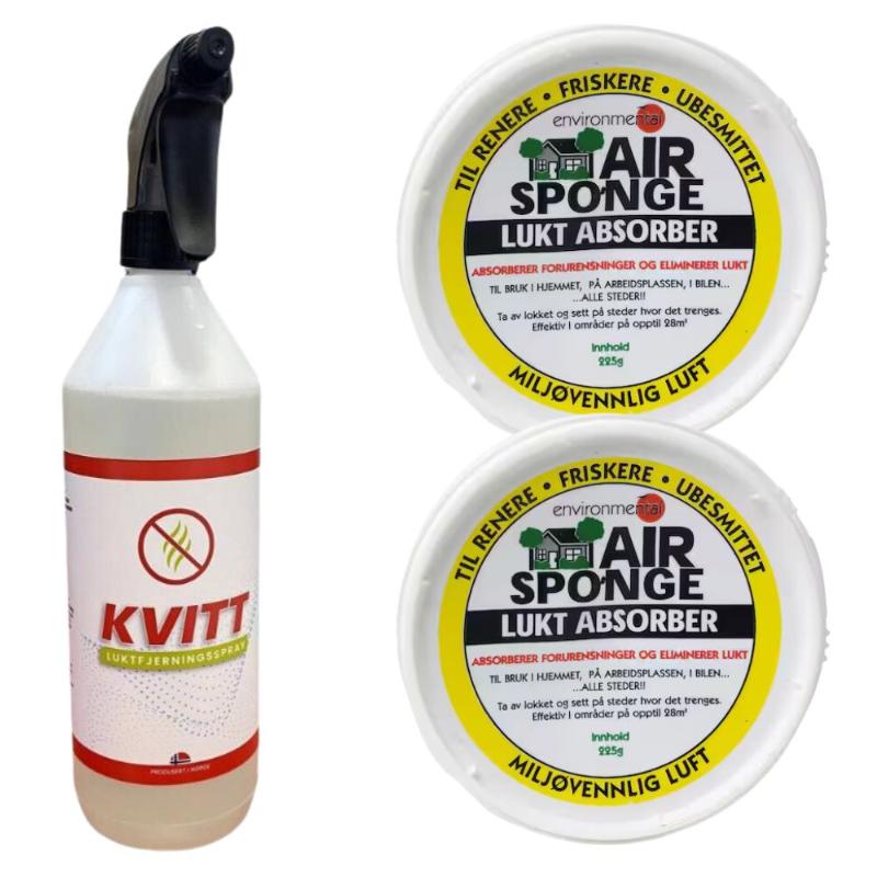 Total Luktfjerning er en komplett pakkeløsning som kombinerer 1 liter Kvitt Luktfjerningsspray og 2 Air Sponge luktabsorberende svamper. Sammen gir de en kraftig og varig effekt mot selv de mest gjenstridige luktene – enten det gjelder kadaverlukt fra gnagere, røyk, matos eller kjæledyrslukt. Perfekt til bruk i hjem, bil, båt, campingvogn eller på kontoret.